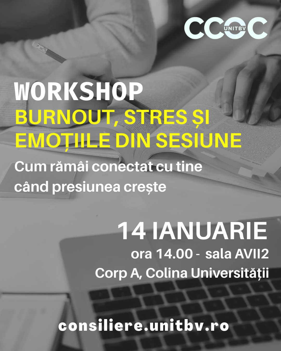 14 ianuarie, ora 14:00, Colina Universității, sala AVII2Sesiunea vine adesea cu presiune, oboseală și emoții intense.Nu pentru că „nu faci suficient”, ci pentru că uneori este pur și simplu prea mult.La workshopul Burnout, stres și emoțiile din sesiune vorbim despre cum să îi faci față stresului, fără să te pierzi pe tine: cum recunoști semnele epuizării, cum îți înțelegi reacțiile emoționale și ce te poate ajuta să rămâi conectat cu tine chiar și în perioade solicitante.